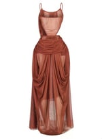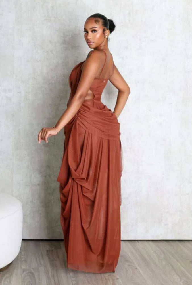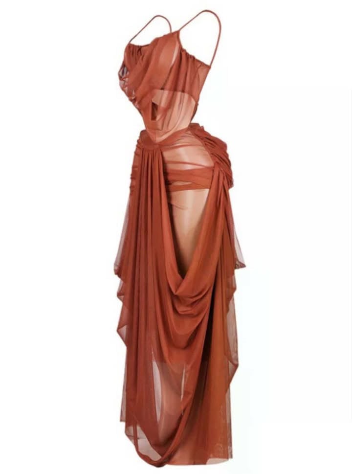 Indulge in pure sophistication with this draped rust chiffon gown that's equal parts sultry and refined. With cascading layers that frame the body and artful cutouts that reveal just enough, Wine & Dine is the definition of effortless seduction.
