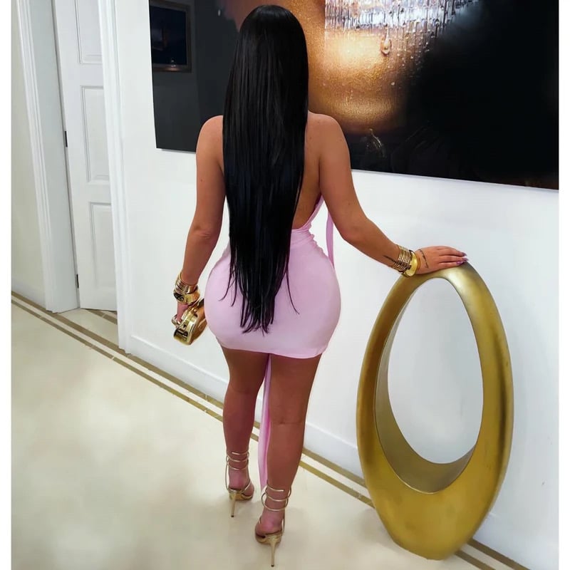 This chic dress stretches and fits true to size. Model is wearing a small.