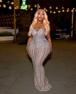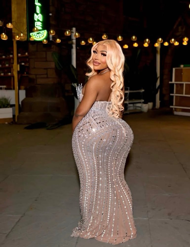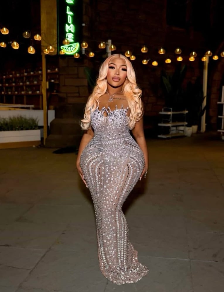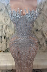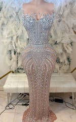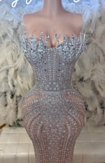 Featuring skin color mesh laced with gems across the whole front part of the dress. . Crystal Chains Drape the sides of the dress as well. Zipper is located at the Side of the dress. This dress has limited stretch we normally recommend sizing up if you’re unsure please message sue before asking